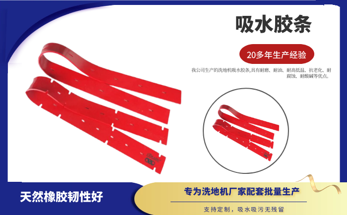 產品說明:吸水膠條是洗地機吸水扒上的重要部件,作用就是與地面接觸,產生一個密封的空間,把地面上的污水通過風機進行回收。吸水膠條一般分為耐油型(進口PU原料)和普通型(進口NR原料)兩種。