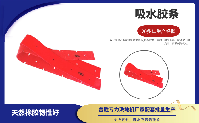 產(chǎn)品說明:吸水膠條是洗地機(jī)吸水扒上的重要部件,作用就是與地面接觸,產(chǎn)生一個密封的空間,把地面上的污水通過風(fēng)機(jī)進(jìn)行回收。吸水膠條一般分為耐油型(進(jìn)口PU原料)和普通型(進(jìn)口NR原料)兩種。